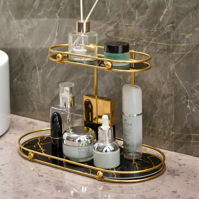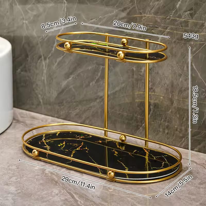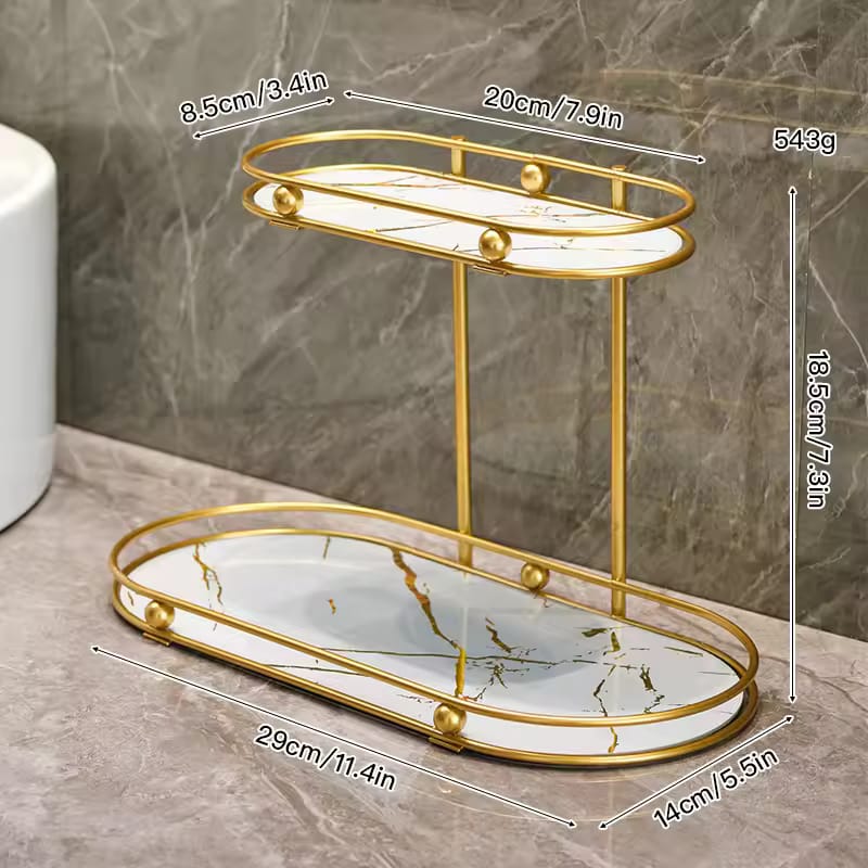 • EASY TO CLEAN: With a sturdy stainless steel frame that can prevent corrosion in wet places and removable ceramic trays with a luxurious marble pattern, this dresser top stand is both functional and easy to clean.